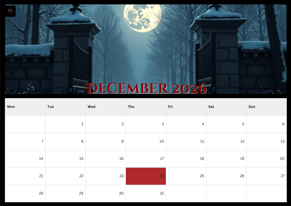 Twelve months of shadow and seduction. A high-resolution digital art collection and printable calendar for 2026. Featuring 12 hauntingly beautiful gothic scenes, marked with the lunar cycles of the vampire.