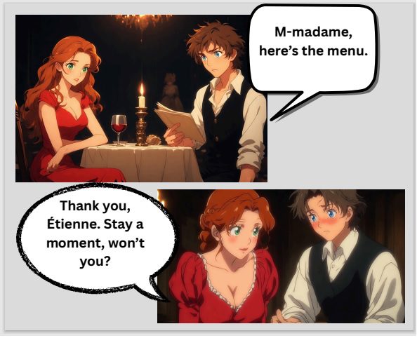 - The Spark (Pages 1–8): Isabelle dines alone, teasing the nervous Étienne as he serves her. A sudden storm traps her, and she boldly books a motel room upstairs, inviting him to join her after his shift. The rain mirrors her growing desire, while Étienne’s shyness wars with intrigue. He leads her to the room, hands trembling as she brushes past coyly.