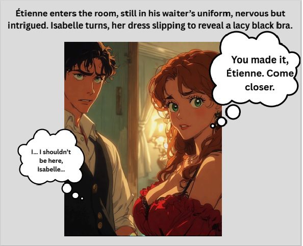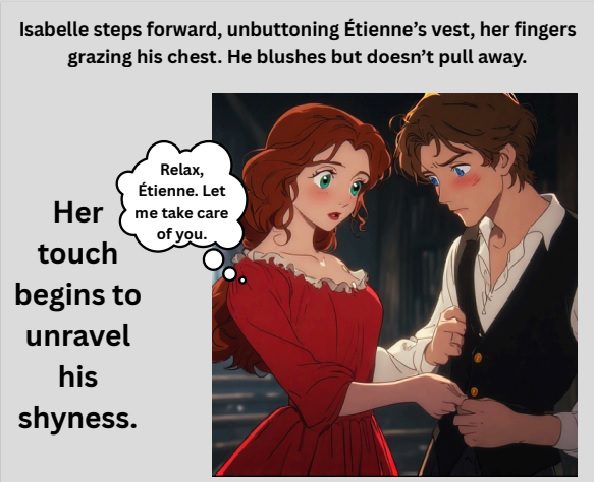 - Building Tension (Pages 9–13): In the dimly lit motel room, Isabelle sheds her inhibitions—her dress slips to reveal lacy black lingerie—drawing Étienne closer. She unbuttons his uniform, kisses him softly, and explores his lean torso with lips and tongue, unraveling his hesitation. He responds tentatively, unhooking her bra to taste her full breasts, his confidence flickering like the storm outside.