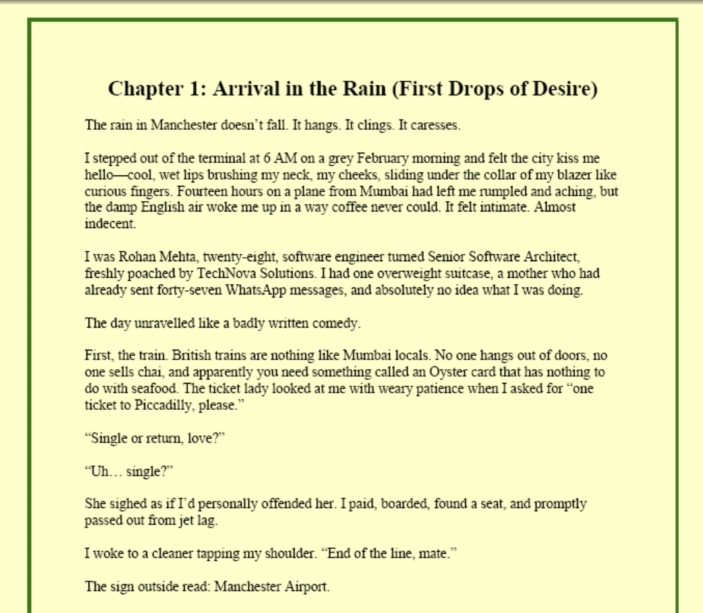 From accidental touches in the narrow aisles of a Northern Quarter bookstore to a fake relationship agreement meant to satisfy prying parents, the tension between Rohan and Emily builds like a Manchester storm. But as the “fake” kisses turn into nights of raw, unbridled passion, they both realize that some things—like the way they fit together behind closed doors—can never be faked.